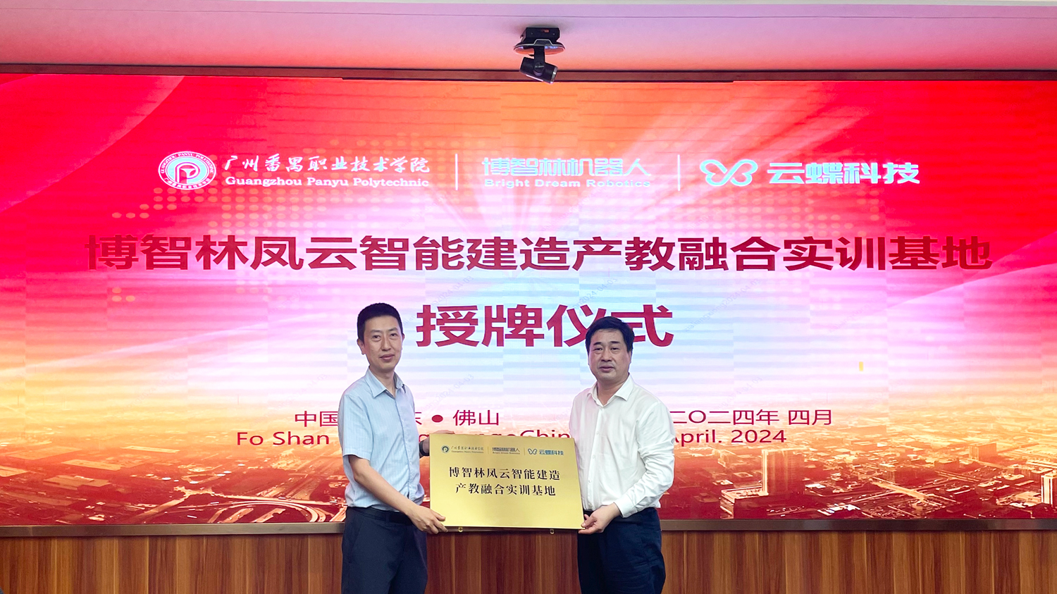 為推進校企深度合作,提升人才培養水平,4月3日,廣州番禺職業技術學院智能建造技術創新中心、產教融合實訓基地揭牌儀式在廣東佛山順利舉行。廣州番禺職業技術學院校長馬仁聽、建筑工程學院院長葉雯、校企合作辦主任齊立輝,博智林副總裁劉震,云蝶科技營銷中心副總經理霍天龍以及多位校方領導、企業代表出席活動。