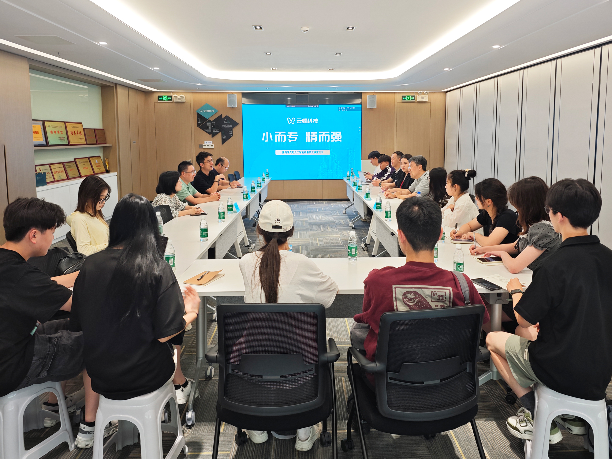 師生們首先走進云蝶科技展廳,詳細了解了公司的發展歷程,以及在人工智能、大數據等領域的核心技術成果及產業應用案例。展廳內展示的智能解決方案和行業賦能實踐引發了師生們的興趣,雙方就技術落地教育、政務、醫療場景等話題進行了現場交流。