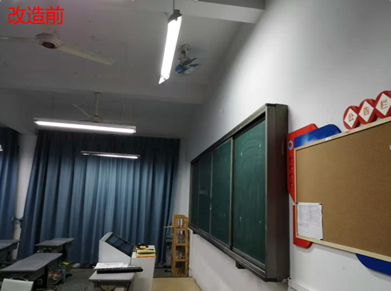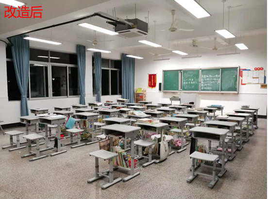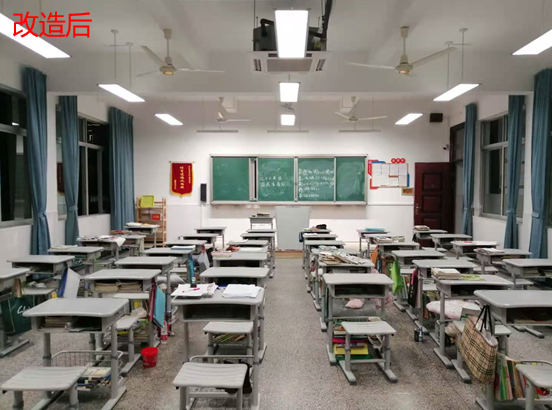 教室改造后課桌照度為311Lx,黑板照度602Lx,優于國家標準,色溫5000K,光線柔和,減少眼疲勞,保護學生視力健康;