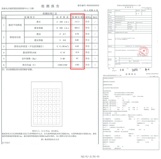 總結:由以上數據可知改造后教室無有害藍光、無眩光、無頻閃危害、高顯色指數、光線柔和。
