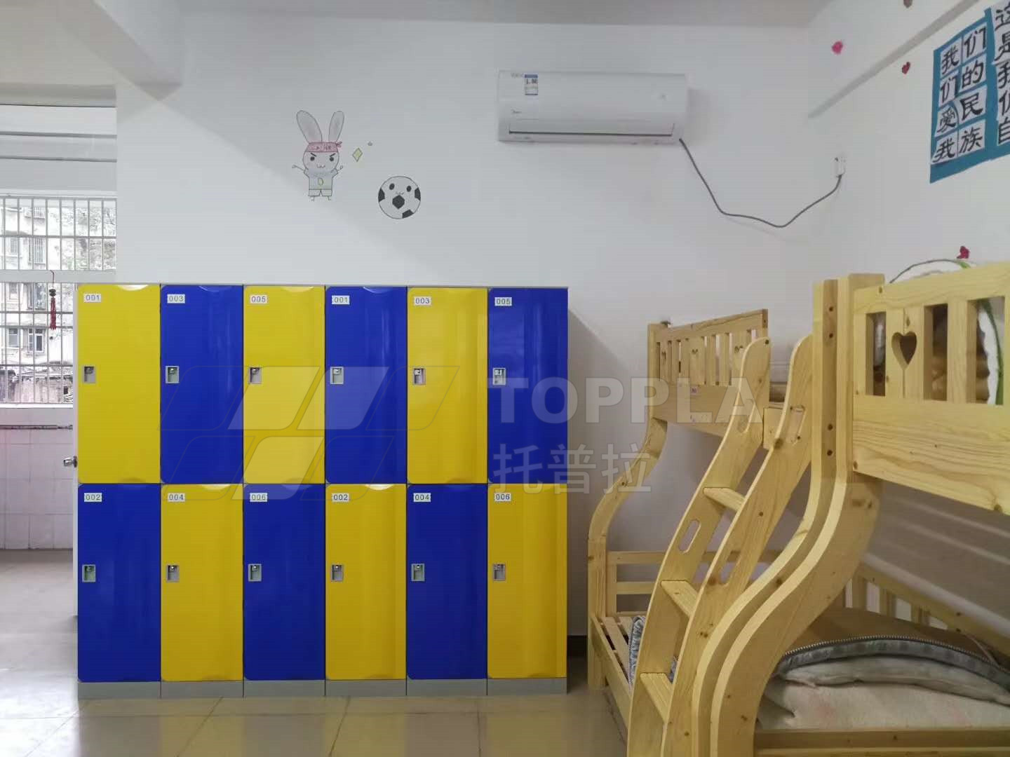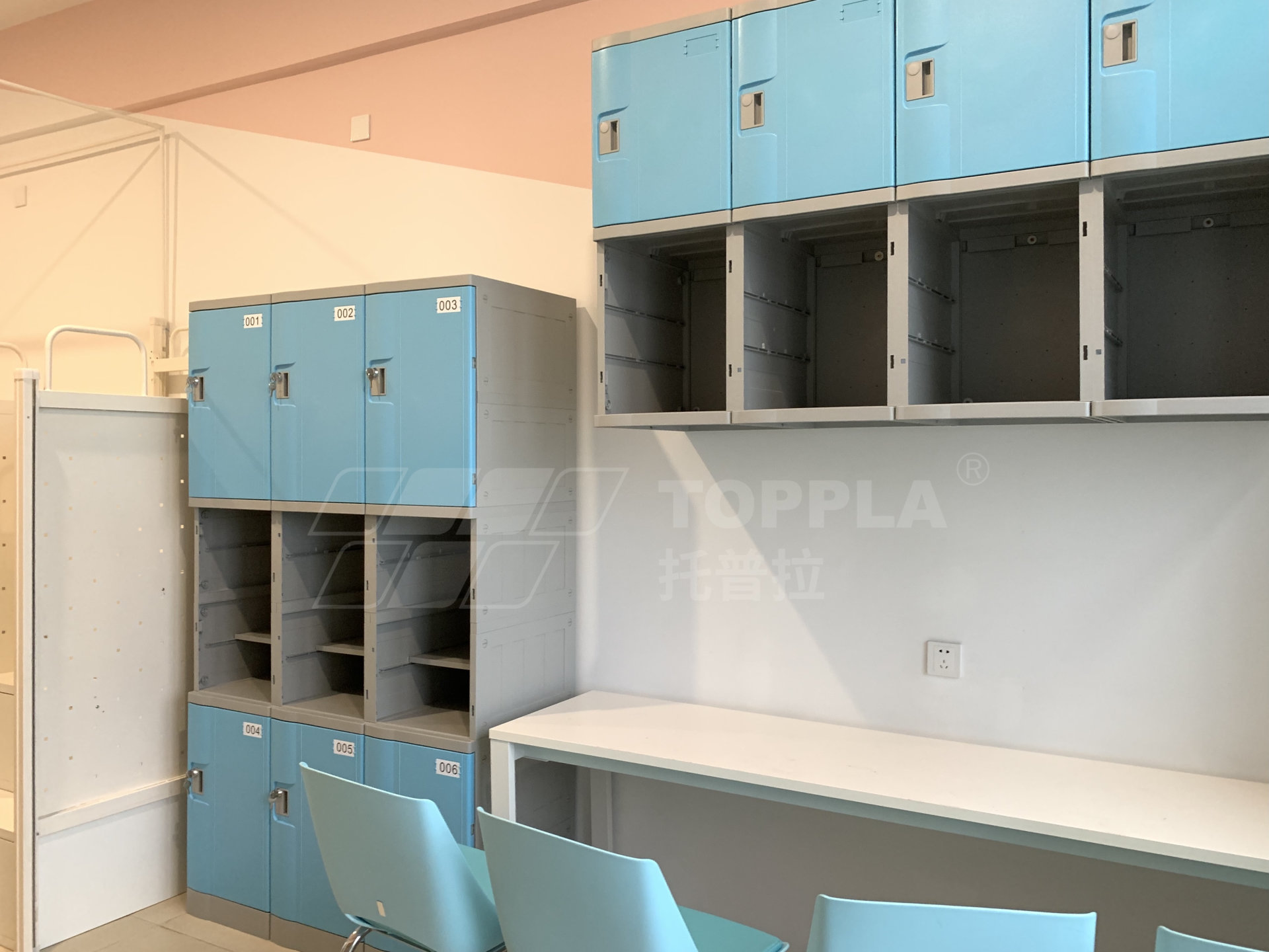 由于空間限制,在宿舍內(nèi)落地放置了3門3列的儲(chǔ)物柜之后,已無(wú)法容下其他收納柜,托普拉在空間局限的條件下,合理利用書桌上方空間,將儲(chǔ)物柜安裝于墻上,即不占用地面面積,又增加了宿舍內(nèi)的儲(chǔ)存空間,一舉兩得。