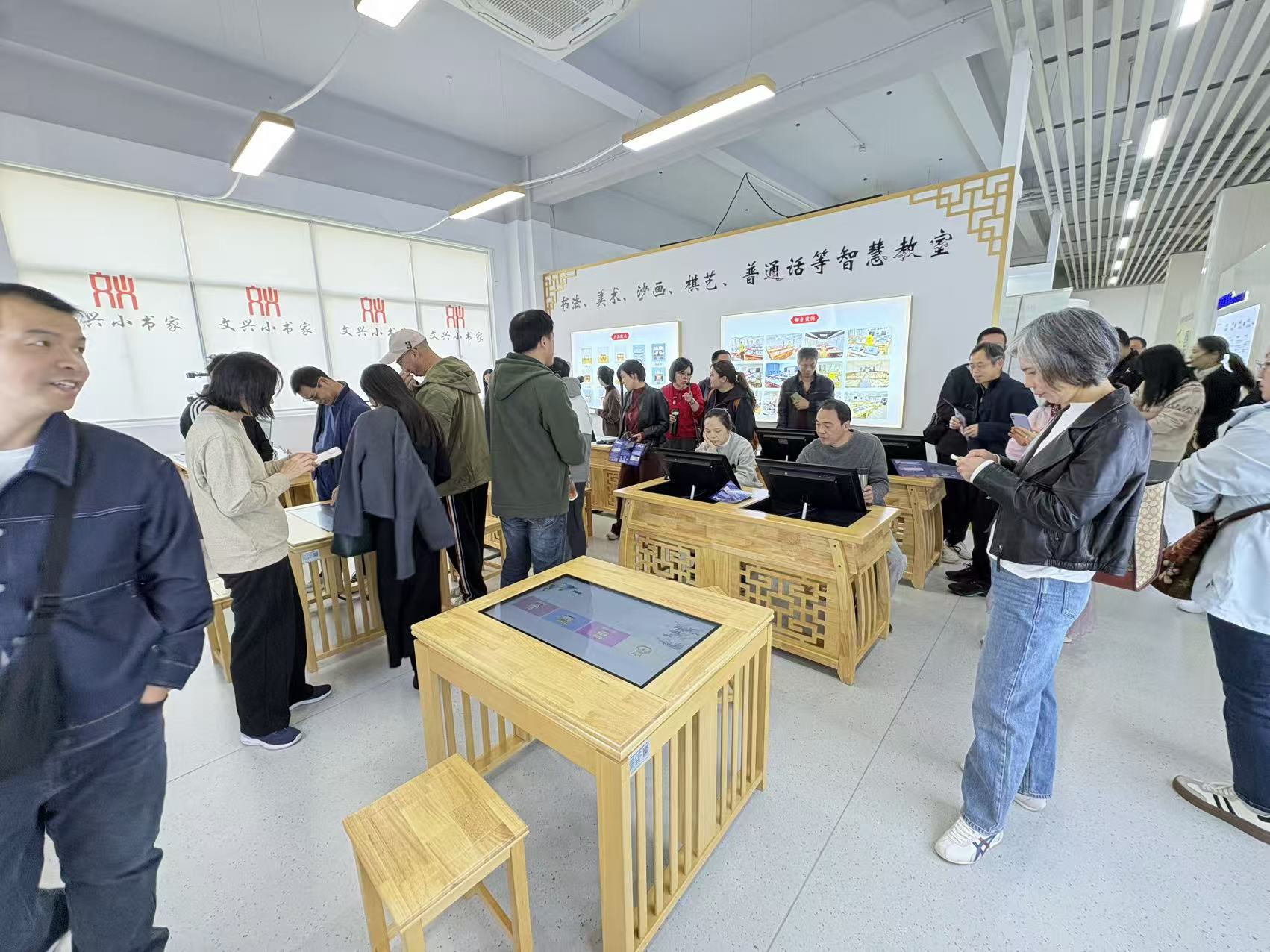 在數字棋藝室,考察團體驗了文興小書家的互動式數字棋藝臺。這款設備支持中國象棋、圍棋、五子棋等多種棋類游戲,配備了10點觸控功能和高清潤眼屏幕,操作流暢且護眼效果顯著。