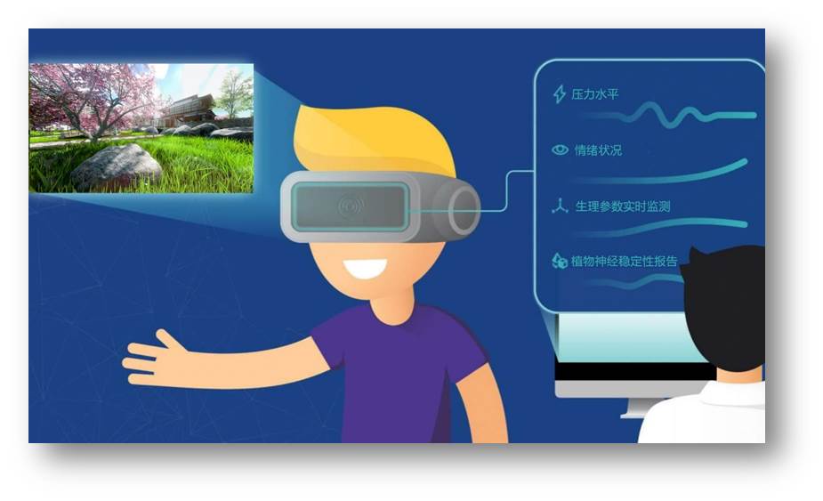 系統能將用戶帶入特定氣氛的場景中,真實地讓用戶感受該場景的氣氛,產生相應的情緒及表現,進而突出生理指標變化,通過這些數值變化,系統能夠將用戶的心率變異性等數據自動繪制成圖,給出評估報告。