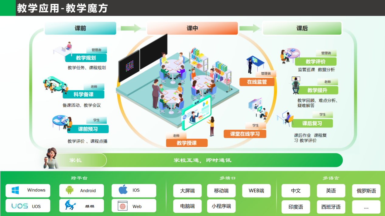「安道教學魔方」構建了完整的教學鏈條:課前支持預習資源推送與學生自主學習;課中結合智能終端(如智能交互平板、PC端、移動端)實現互動教學,提升課堂參與度;課后依托數據分析生成學情報告,輔助鞏固與測評,形成“因材施教"的動態反饋機制。當前,安道教學魔方深度融合國產化生態適配統信、麒麟等操作系統,確保從Windows系統切換的無縫過渡,保障信息安全與用戶使用的流暢性。