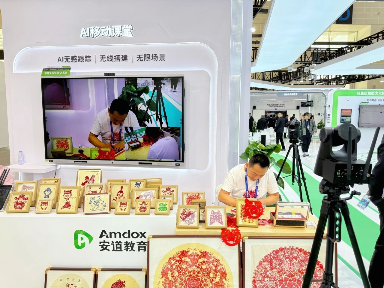 在安道AI移動課堂專區,正進行著一場別開生面的非遺剪紙課堂�,F場,沒有傳統便攜錄播系統線路的雜亂,連接復雜的布局,僅僅只有一臺便攜錄播一體機、一臺無線云臺攝像機、領夾麥克風,便輕松實現課堂現場的傳播與錄制。這節課堂同時也在線上同步直播,在AI技術的加持下,剪紙老師的剪紙畫面被賦予了更多的畫面特寫,讓線上收看直播的觀眾也能和現場觀眾一樣收看清晰現場畫面。
