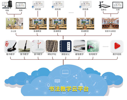 為全面服務于校園書法教育,結合書法學科的特點,產品采用了云服務架構,保證軟件內容實時自動更新,讓學校能夠永久享受到互聯網+教育的便捷性。同時,依托行業領先的云平臺構建書法云服務,讓學校所有教室的班班通大屏、一體機或投影設備的都可以開展書法教學工作,不用安裝額外的硬件設備,不增加學校負擔。通過瀏覽器訪問書法云平臺,無需安裝其它軟件,易于擴展功能,使用簡單,維護方便。同時,為教學平臺提供海量在線教學資源,內容實時更新,無需手動下載,解決學校教室緊張、排課困難和師資緊缺等多方面問題,實現了“智慧書法教室”學書法,“普通教室”練書法的新思路,最大化學校書法教室的建設價值。