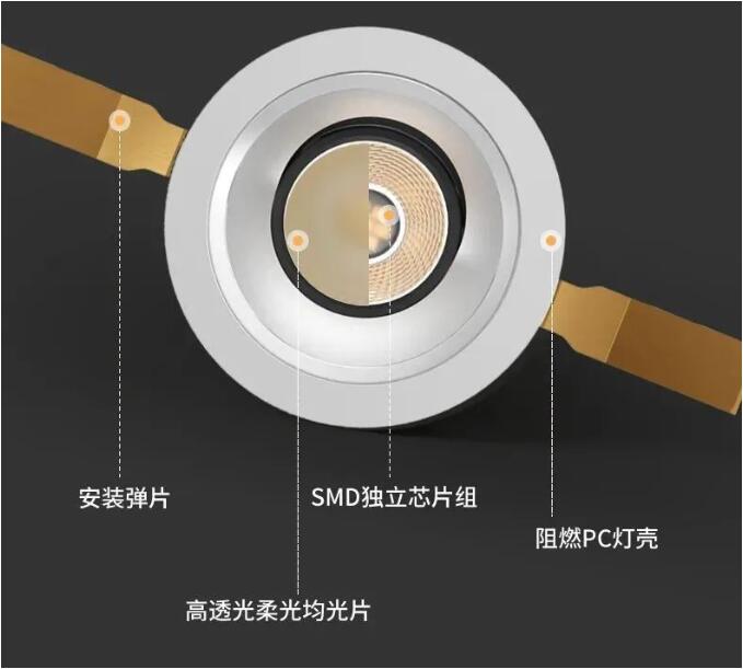 在防眩光設計上,宜美照明萬花筒射燈采用的是深藏光源與使用高透光柔光均光片雙重保障,光源深至46.3mm,能避免光源直射眼睛,從而更加柔和。