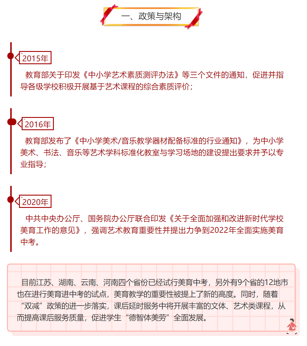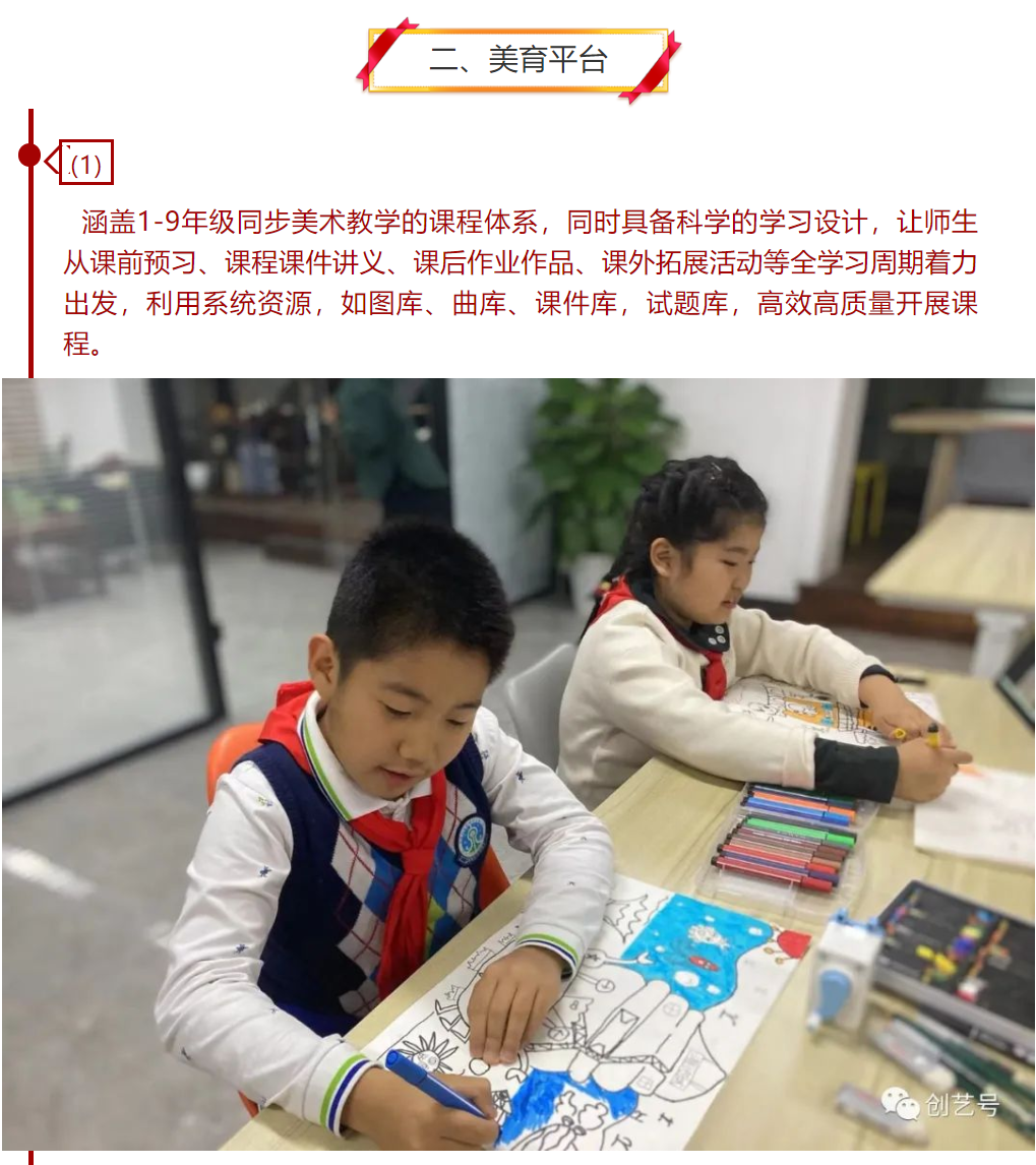 | 區(qū)域美育整體解決方案。創(chuàng)藝號(hào)美育綜合建設(shè)方案,做到“三建設(shè),三提升”,建設(shè)美育創(chuàng)新型課程模式,提升區(qū)域整體教學(xué)能力;建設(shè)美育發(fā)展性評(píng)價(jià)體系,提升學(xué)生藝術(shù)綜合素養(yǎng);建設(shè)美育專業(yè)化場(chǎng)地課程,提升學(xué)校優(yōu)質(zhì)特色發(fā)展,有效服務(wù)美育進(jìn)校園、進(jìn)中考。 |