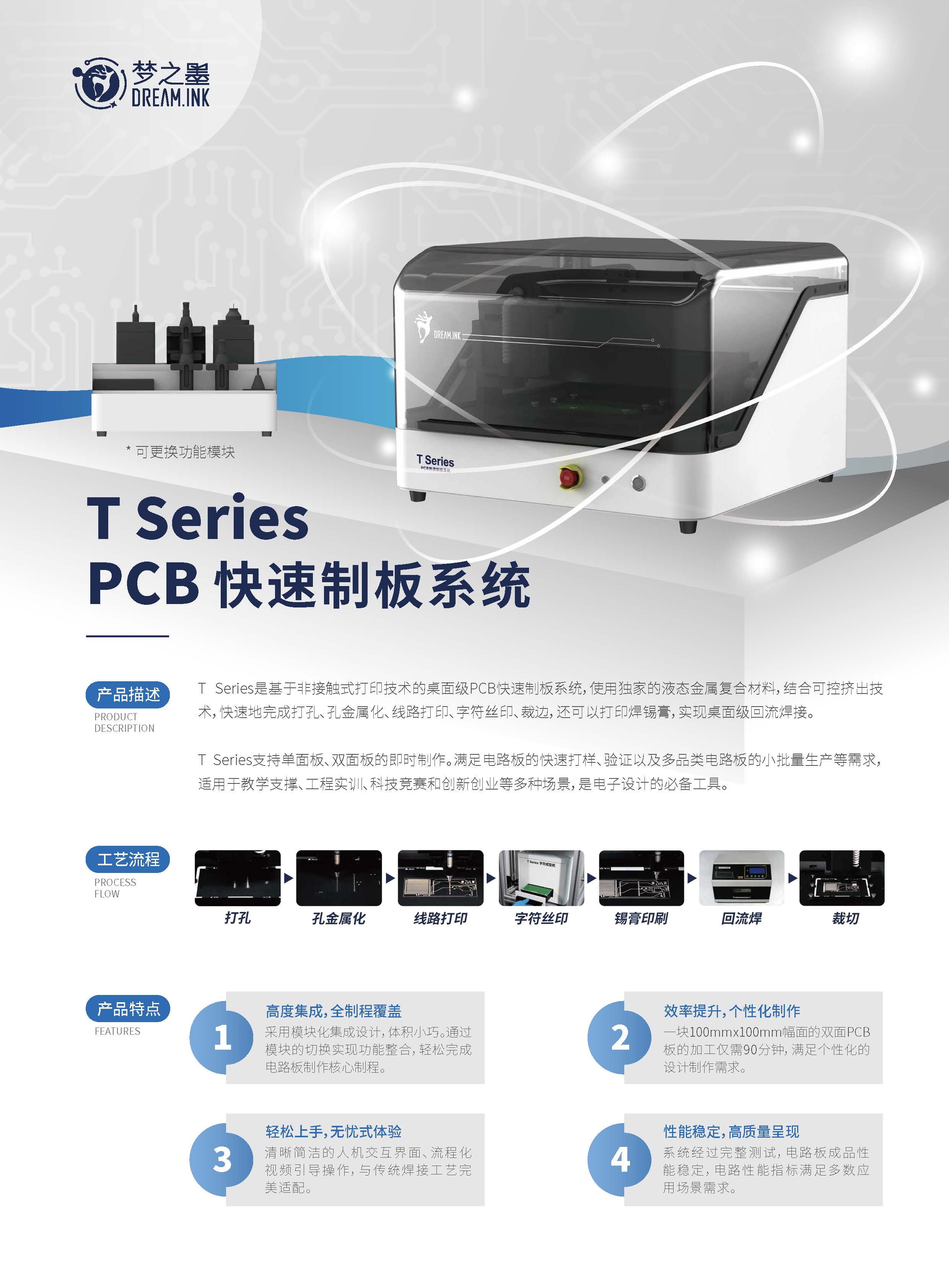 產(chǎn)品詳細(xì)介紹產(chǎn)品描述 T Series是基于非接觸式打印技術(shù)的桌面級PCB快速制板系統(tǒng),使用液態(tài)金屬復(fù)合材料,結(jié)合可控?cái)D出技術(shù),快速地完成打孔、孔金屬化、線路打印、字符絲印、裁邊,還可以打印焊錫膏,實(shí)現(xiàn)桌面級回流焊接。 T Series支持單面板、雙面板的即時制作。滿足電路板的快速打樣、驗(yàn)證以及多品類電路板的小批量生產(chǎn)等需求,適用于教學(xué)支撐、工程實(shí)訓(xùn)、科技競賽和創(chuàng)新創(chuàng)業(yè)等多種場景,是電子設(shè)計(jì)的必備工具。 產(chǎn)品特點(diǎn) 1、高度集成,全制程覆蓋 采用模塊化集成設(shè)計(jì),體積小巧。通過模塊的切換實(shí)現(xiàn)功能整合; 2、效率提升,個性化制作 一塊100mmx100mm幅面的雙面PCB板的加工僅需90分鐘,滿足個性化的設(shè)計(jì)制作需求; 3、輕松上手,無憂式體驗(yàn) 清晰簡潔的人機(jī)交互界面、流程化視頻引導(dǎo)操作,與傳統(tǒng)焊接工藝完美適配; 4、性能穩(wěn)定,高質(zhì)量呈現(xiàn) 系統(tǒng)經(jīng)過完整測試,電路板成品性能穩(wěn)定,電路性能指標(biāo)滿足多數(shù)應(yīng)用場景需求。 |