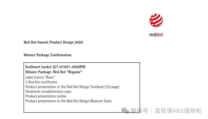 近日,富桂通EcoSmart智能儲物柜憑借前瞻性的設計理念、極致的產品體驗與硬核的創新實力,成功斬獲2026年德國紅點產品設計大獎(RedDotDesignAward)。這是繼拿下德國IF設計大獎后,富桂通在國際設計領域收獲的又一重磅榮譽,一舉拿下德國兩大頂級設計獎項的“大滿貫”,用實力證明了中國智造的設計力量!