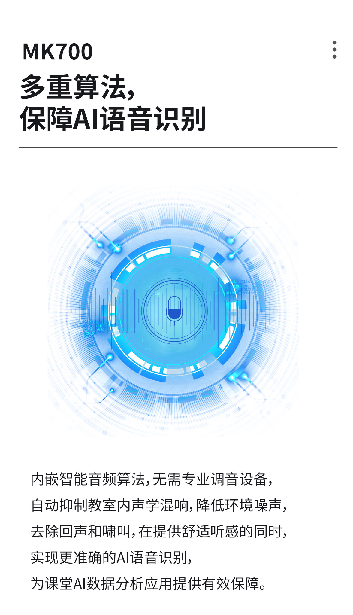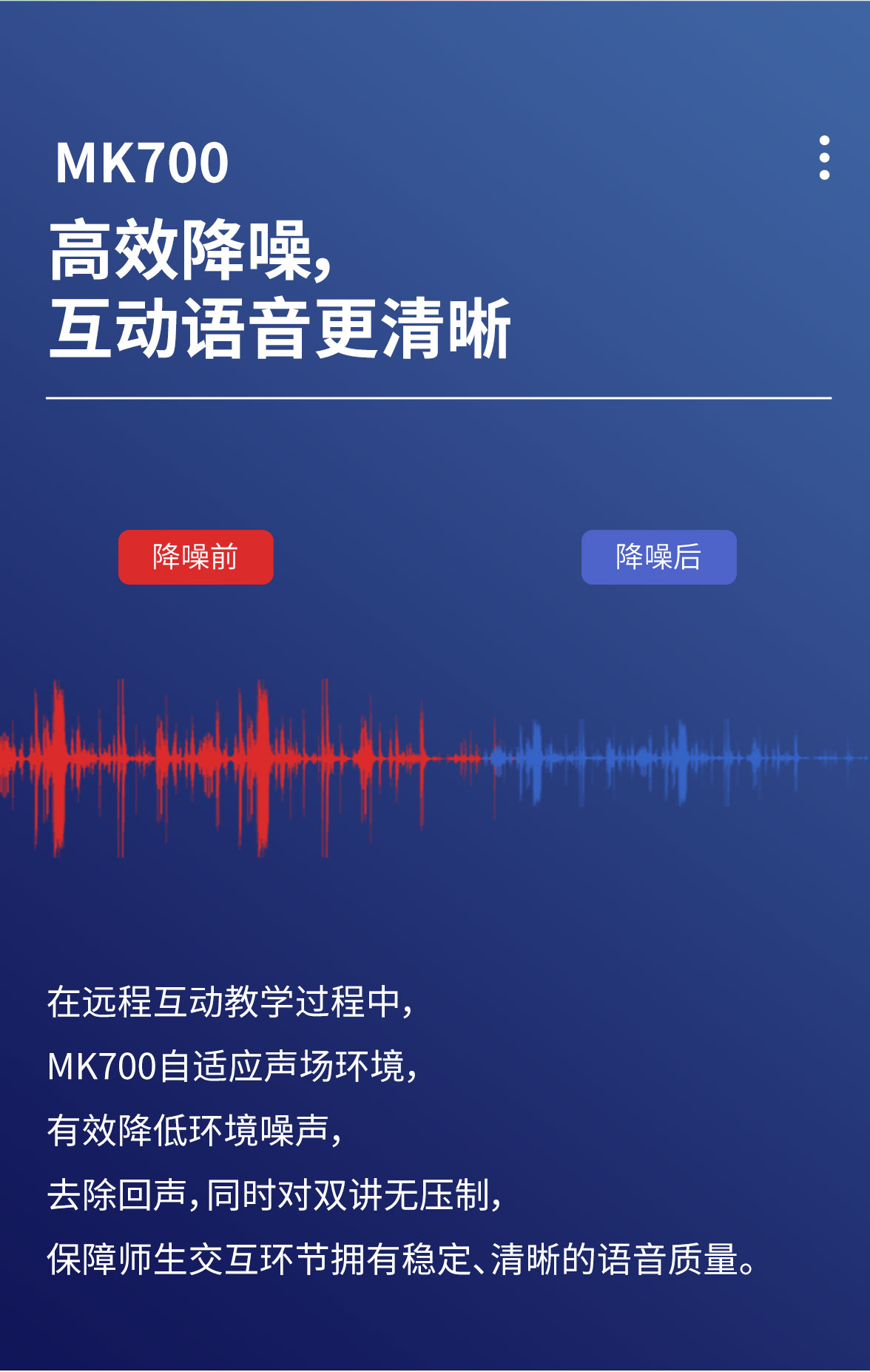 現代中慶數字陣列麥克風MK700,對不同空間方向的聲音信號進行空時處理,所具備的遠距離拾音、噪聲抑制、混響去除、陣列增益等功能,能夠更清晰還原課堂聲音,為優質課資源應用和課堂AI數據分析提供了更為卓越的聲音保障。