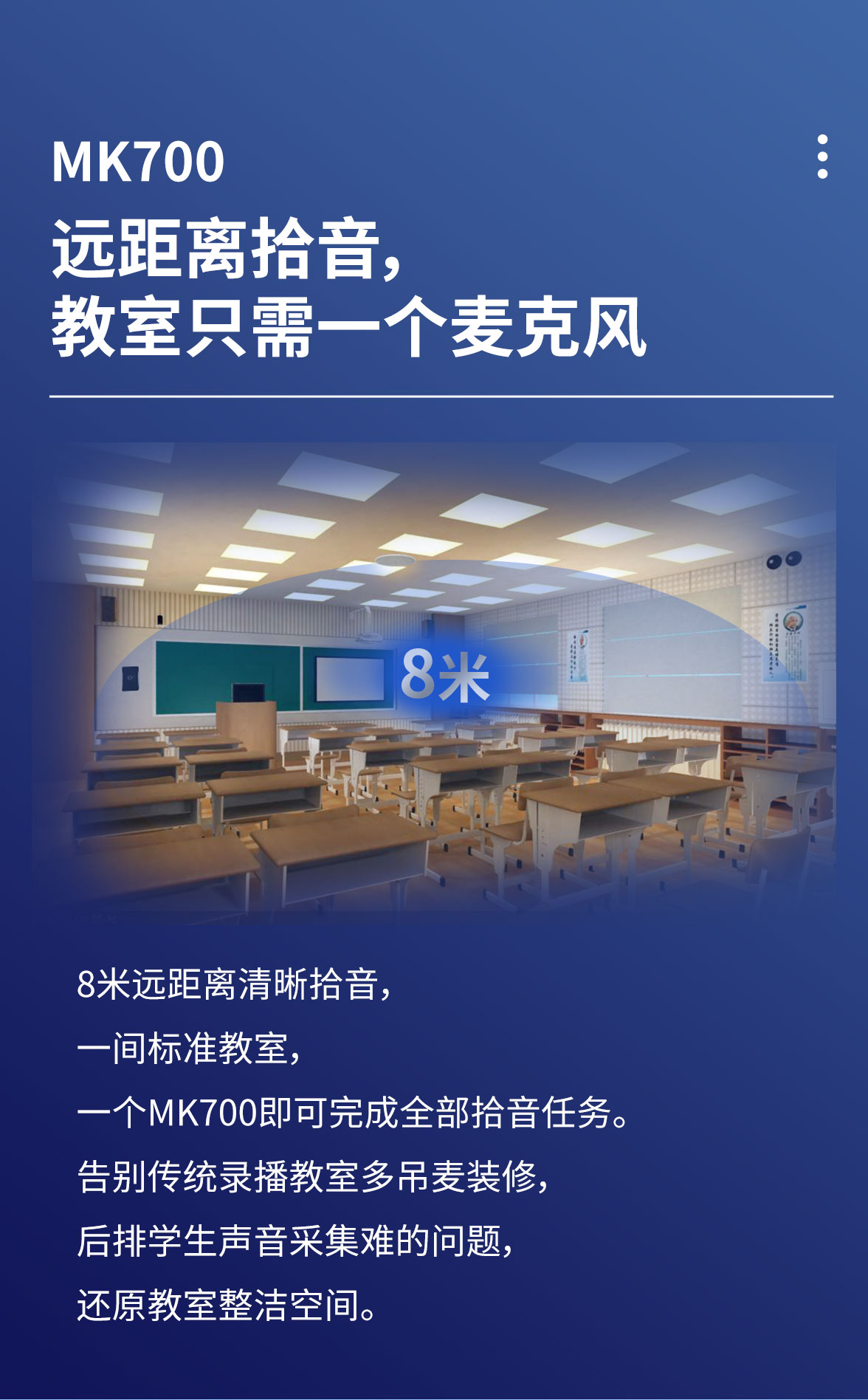現代中慶推出數字陣列麥克風MK700,大幅提升錄播拾音效果,為遠程互動教學、優課資源建設和AI語音識別提供了優質的聲音保障。