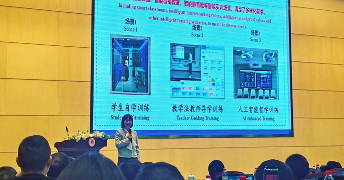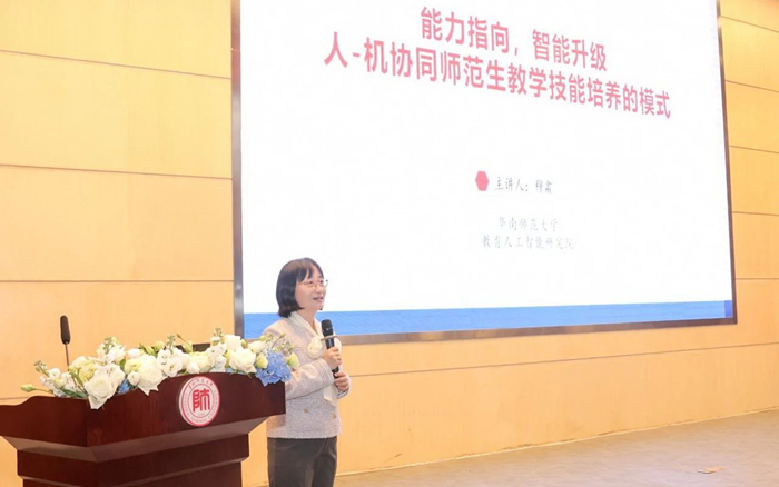 穆肅教授的報告通過華南師大與現代中慶共同組建的“師范生智能實訓關鍵技術與場景示范產學研基地”實踐,向參會嘉賓介紹了學校探索人工智能賦能師范生教學技能高質量培養的途徑和模式。