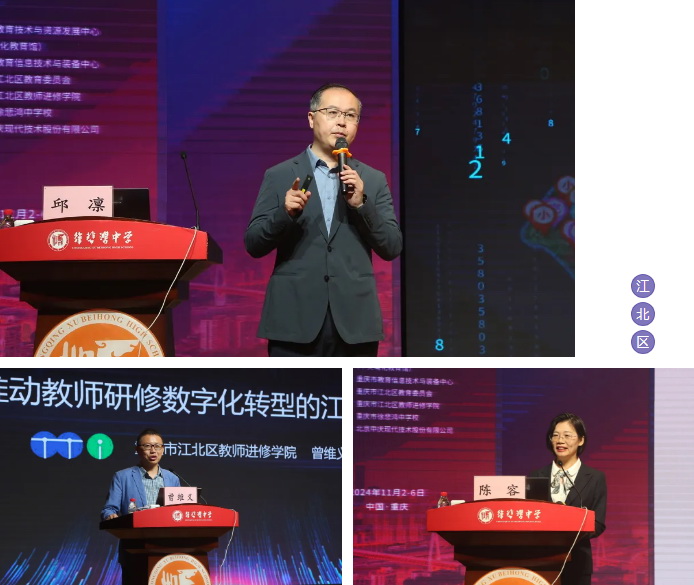 江北區(qū)在重慶市江北區(qū)智能教育應用創(chuàng)新展示中,邱凜、曾維義、陳容先后分享了江北區(qū)教育及教研數(shù)字化轉(zhuǎn)型,以及徐悲鴻中學創(chuàng)美課堂與人工智能創(chuàng)新應用探索的成功經(jīng)驗。