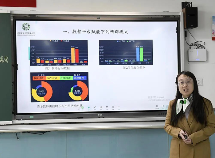 活動(dòng)開(kāi)始,北京建筑大學(xué)附屬小學(xué)黨支部書(shū)記、校長(zhǎng)鄭新致辭并領(lǐng)銜團(tuán)隊(duì)介紹了學(xué)校近年來(lái)開(kāi)展人工數(shù)智技術(shù)賦能教學(xué)的實(shí)踐探索。2023年,學(xué)校參與了北京市數(shù)字教育研究課題——“基于云課堂評(píng)價(jià)系統(tǒng)的數(shù)據(jù)反饋以提升小學(xué)課堂評(píng)價(jià)的實(shí)踐改進(jìn)研究”,裝備了現(xiàn)代中慶人工數(shù)智系統(tǒng),在全校范圍內(nèi)開(kāi)展了人工數(shù)智技術(shù)在小學(xué)學(xué)科課堂評(píng)價(jià)中的應(yīng)用與研究,教師們積極參與,開(kāi)創(chuàng)了評(píng)課和教研的數(shù)智新模式。