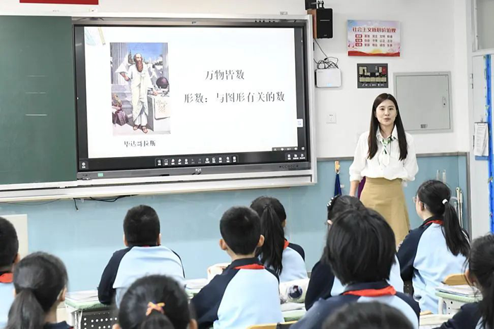 數(shù)學(xué)教研組組長(zhǎng)楊秀麗老師結(jié)和王方老師執(zhí)教的《數(shù)與形》一課進(jìn)行研究匯報(bào),在前期試講中,AI課堂評(píng)價(jià)系統(tǒng)記錄師生行為數(shù)據(jù)呈現(xiàn)出老師講授多,學(xué)生在老師引導(dǎo)下被動(dòng)聽(tīng)的情況,這樣的教學(xué)特別容易出現(xiàn)學(xué)生和老師脫節(jié)的現(xiàn)象。對(duì)此,楊秀麗老師對(duì)教學(xué)環(huán)節(jié)做了調(diào)整,把數(shù)學(xué)家畢達(dá)哥拉斯的故事從課中調(diào)整到引入部分,在這次課例展示中,可以明顯看到調(diào)整后課堂氛圍明顯活躍,學(xué)生學(xué)習(xí)積極性也更高了。