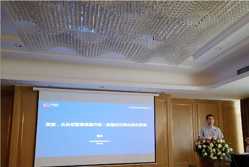“產學研高峰論壇”中,長虹教育科技有限公司市場總監蔣兵以“改變,從長虹智慧課堂開始:教室的可視化綜合管理“為主題發表了精彩的演講與分享,詳細闡述了長虹教育科技是如何利用可視分析與人工智能技術改變智慧課堂,通過可視化實現教室綜合管理。
