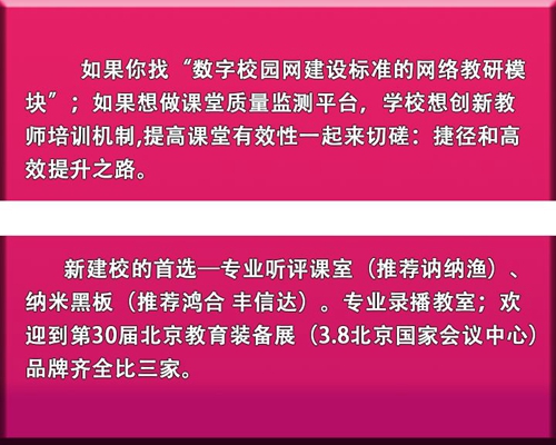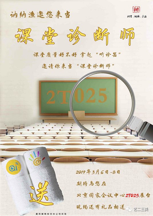 第30屆(2019年)北京教育裝備展示會暨北京教育裝備論壇將于2019年3月6日至8日在國家會議中心召開。另,展會期間,訥納漁展位還為現場參與評課的“診斷師”準備了小驚喜,期待您的光臨!