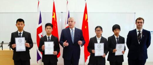 隨后約克公爵安德魯王子為韓政、黃薇丹、劉瑜堃、趙雨初等4名學生頒發“IDEA-Digital Business Award”證書,劉瑜堃獲得銅獎,黃薇丹、韓政、趙雨初三位學生獲得銅銀雙獎。此獎項是由英國約克公爵安德魯王子發起的,全球范圍內學生自主報名申請,通過一系列的在線挑戰,考核申請者在數字編程、就業、創意等方面的綜合技能后授予的獎項。目前融僑賽德伯學校的學生為福建省首批獲獎者,并得到英國約克公爵安德魯王子的親自頒獎。同時約克公爵安德魯王子在“共慶教育成為聯結中英之紐帶”的銅匾上留下簽名。