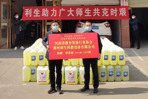 協(xié)會(huì)副會(huì)長(zhǎng)單位鄭州利生科教設(shè)備有限公司在做好企業(yè)自身疫情防控的同時(shí),積極與慈善部門聯(lián)系,第一時(shí)間向慈善部門捐贈(zèng)現(xiàn)金15萬(wàn)元,并多方籌措了數(shù)十噸價(jià)值六十余萬(wàn)元的84消毒液、紅外測(cè)溫計(jì),酒精等物資,準(zhǔn)備專車專人,疫情期間行程幾千公里,捐贈(zèng)給鄭州市教育局、洛陽(yáng)市教育局、開(kāi)封市教育局、鶴壁市教育局、三門峽市教育局、金水區(qū)教育局、新密市教育體育局、新密市人力資源和社會(huì)保障局、洛陽(yáng)市老城區(qū)教育體育局、洛陽(yáng)市洛龍區(qū)教育體育局、許昌市魏都區(qū)教育體育局、襄縣教育局、禹州教育局、鄭州市二七區(qū)教育局、湯陰縣教育局、安陽(yáng)市教育局、漯河市源匯區(qū)教育局、南陽(yáng)市教育局等單位。目前,還有多個(gè)地市的教育系統(tǒng)正在積極對(duì)接中。