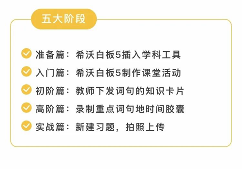除了這些,老師實際遇到的難題可能還有很多。別擔心,今天就教各位老師利用希沃白板5的學科工具—單詞卡,結合希沃易課堂教師空間的資源推送,讓各位老師輕輕松松攻克以上難題。我們將按照以下五個階段,一步步解鎖新技能 ↓↓↓