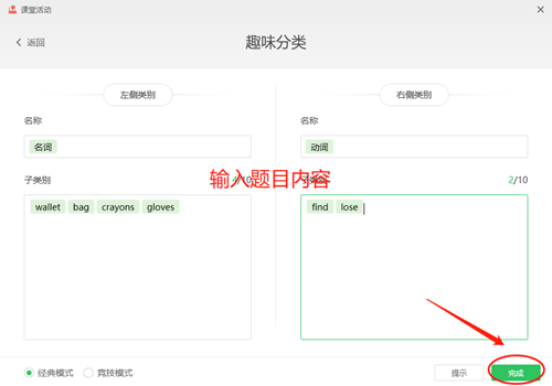 創設好的課堂活動游戲,可以通過課件推送給學生,學生直接在課件上進行操作,學習單詞之余利用課堂小游戲可以緩解學習的枯燥,還可以通過游戲進一步認識英語單詞。活動形式多樣,有趣味分類、選詞填空、判斷對錯等等,老師們可以嘗試一下。