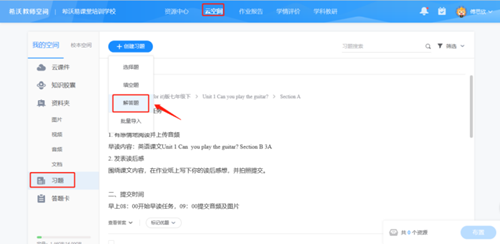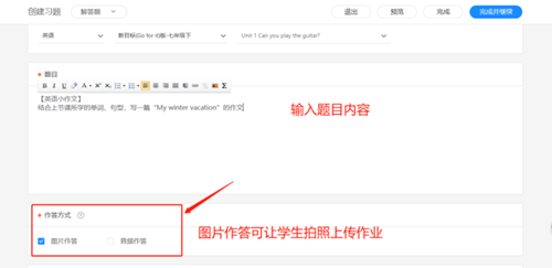 添加習題,可以從資源中心挑選習題,也可以自己上傳。當然也非常推薦各位老師自己布置一道作文題目,讓學生在家中寫好一篇小作文,拍照上傳。小作文的形式可以更加全面地了解學生對單詞句型的運用。