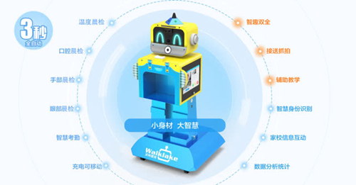 該機器人3秒鐘即可完成體溫、眼部、口部、手部四個方向的20多項晨檢篩查檢測功能,并實時向家長老師告知健康信息,數據平臺也可以進行實時監測管理。
