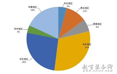 根據5月份教育裝備招標采購信息地區統計圖(見圖3)和占比圖(見圖4)可以看出:華東地區需求量最大,其招標采購信息量870條,占全部信息量的31%;其次是華北地區,其招標采購信息量733條,占全部信息量的26%;華南地區招標采購信息量510條,占全部信息量的18%,位列第三;西北地區招標采購信息量300條,占全部信息量的11%;位列第四;西南地區招標采購信息量177條,占全部信息量的6%,位列第五;東北地區教育裝備招標采購信息量118條,占全部信息量的4%;華中地區招標采購信息量108條,占全部信息量的4%,并列末位。