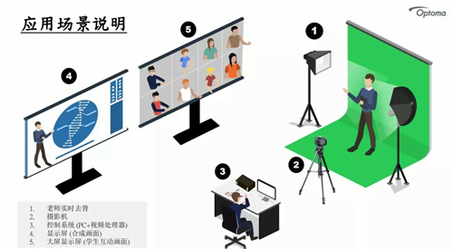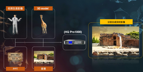 在使用這套系統(tǒng)時(shí),教師一個(gè)人就能完成授課過(guò)程:教師在綠幕棚進(jìn)行錄像,影像將會(huì)被傳輸?shù)綂W圖碼HQ Pro 1000影音處理器中,處理器會(huì)將課程需要的的背景畫(huà)面、PPT簡(jiǎn)報(bào)、3D畫(huà)面甚至AR影像與教師講課的身影融合,呈現(xiàn)出更加的沉浸的教學(xué)效果,然后實(shí)時(shí)將畫(huà)面?zhèn)鬟f到學(xué)生的屏幕上。