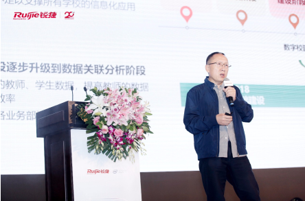 最后,重慶市沙坪壩區教師進修學院副院長、督學,重慶市智慧校園建設指南基礎教育編寫組副組長胡巨波做了“終身學習身份治理,教育管理數據大腦”的主題分享,展示銳捷雙中臺方案在教育教學決策分析上的應用。
