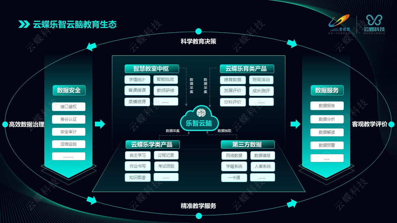 云蝶樂(lè)智云腦平臺(tái)融合了云蝶軟硬件產(chǎn)品的數(shù)據(jù),也支持第三方數(shù)據(jù)的對(duì)接,最終經(jīng)過(guò)云腦處理,為用戶提供數(shù)據(jù)報(bào)告、數(shù)據(jù)分析、數(shù)據(jù)解讀、數(shù)據(jù)決策、數(shù)據(jù)預(yù)警等服務(wù),形成以云蝶樂(lè)智云腦為中心的教育生態(tài)閉環(huán)。