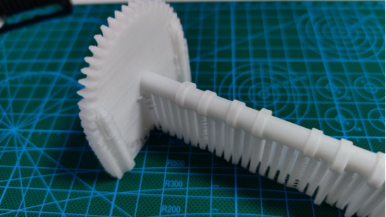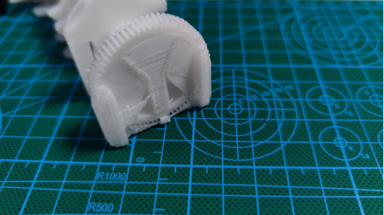 白色耗材為極光爾沃官方PLA耗材,打印的零件表面基本找不出瑕疵,十分光滑,作為運動件也不需要在拋光即可使用。通過墊板上的測量尺可以對比出來,第2張圖的小齒輪間隙只有約3mm,然而即使是如此細小的細節,A6也將其完美的還原了出來,并沒有出現我們意料中可能出現的變現情況。
