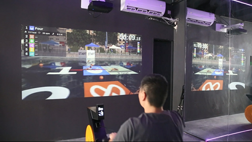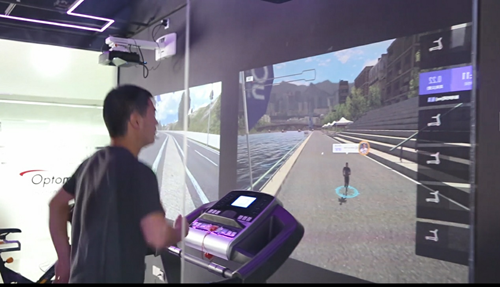奧圖碼數位健身解決方案,透過專業投影顯示系統、平板計算機及傳感器等硬件結合,將真實運動體感轉為各種參數數據,從而為健身人士模擬出真實環境。