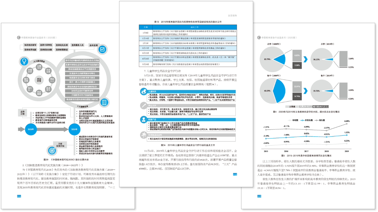 《中國教育裝備行業藍皮書》是我國教育裝備行業唯一的年鑒類研究報告集,自2012年起已連續編印9版。2020版藍皮書設“發展報告”和“專題報告”兩大板塊。前者通過1篇全景式報告,聚焦我國教育裝備行業整體發展情況,對行業發展的年度宏觀環境、政策法規導向、重要事件節點等進行了全方位記錄與解析,提出了發現與觀點;后者則精選了23篇反映行業重點領域發展情況或分析熱點議題的研究報告,通過多樣化的視角立體呈現了行業的最新趨勢。