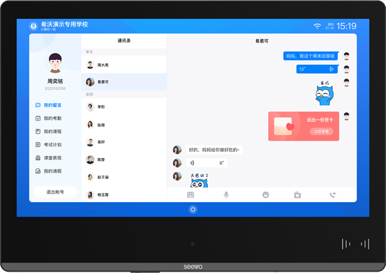 手機禁入校園后,家長最擔心的就是無法及時與學生建立聯系,不了解孩子的在校情況。希沃云班牌的NFC刷卡識別和人臉識別功能,讓學生以刷卡或刷臉的方式快速登錄個人賬號,通過班牌實時向家長發送留言,留言形式豐富,包括文字、語音、表情包等。家長也可以通過手機直接發送留言給孩子,孩子可以在課間刷卡閱讀和回復。