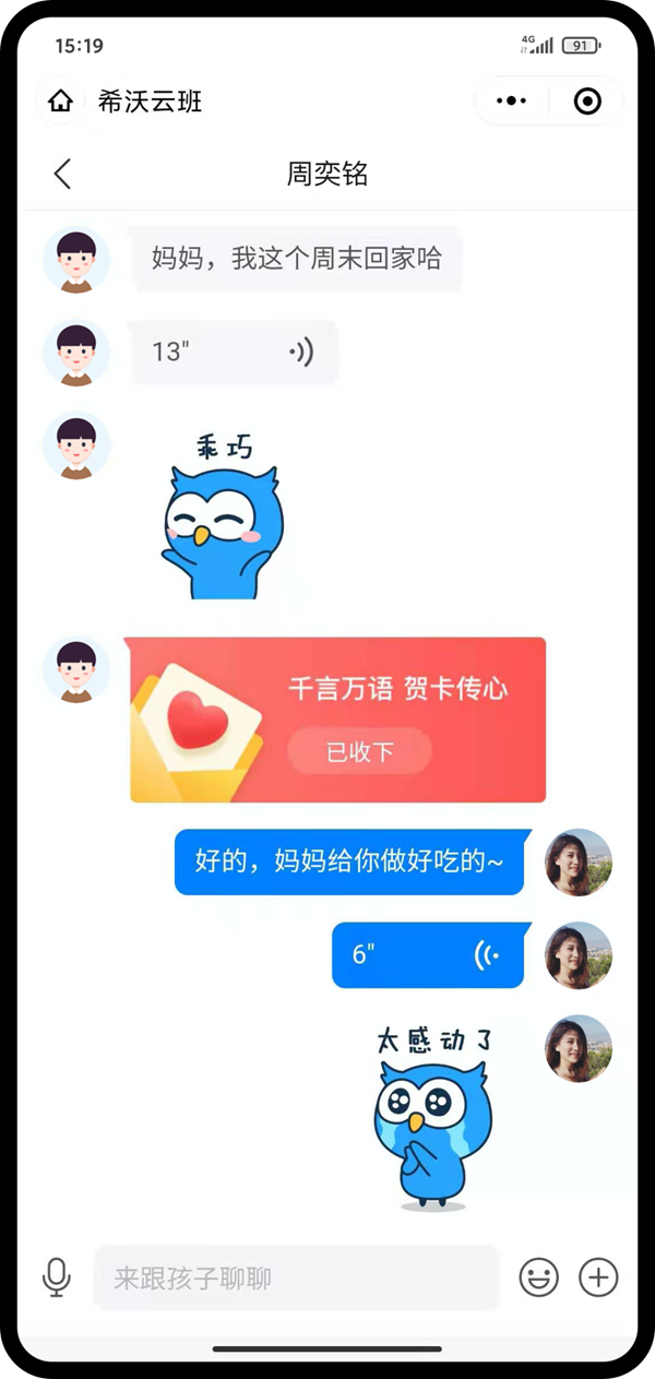 遇到特殊節日,學生可以向家長發送賀卡,表達自己的節日祝福和感恩。賀卡以留言的方式推送,多樣的留言形式讓文字充滿溫度,讓溝通更能傳遞情感。