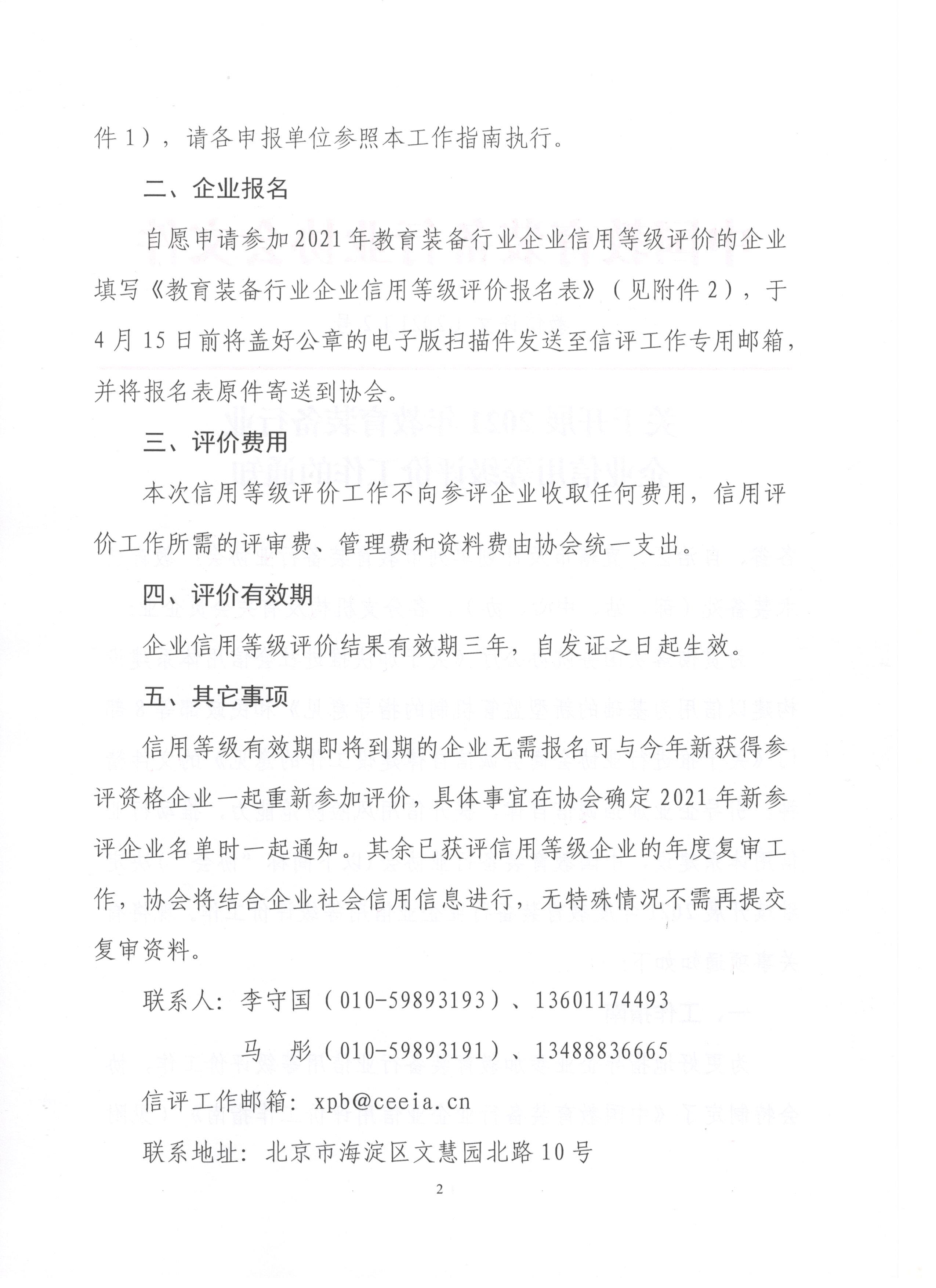 自愿申請參加2021年教育裝備行業企業信用等級評價的企業填寫《教育裝備行業企業信用等級評價報名表》(見附件2),于4月15日前將蓋好公章的電子版掃描件發送至信評工作專用郵箱,并將報名表原件寄送到協會。
