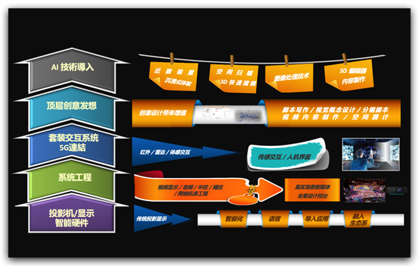 從投影機(jī)/顯示智能硬件(智能化/語音/導(dǎo)入應(yīng)用/融入生態(tài)系)到 系統(tǒng)工程(視頻顯示/音頻/中控/播控/網(wǎng)絡(luò)機(jī)房工程,真實(shí)場景新媒體全案設(shè)計(jì)控臺)到 套裝交互系統(tǒng)5G連結(jié)(紅外/雷達(dá)/體感交互,傳感交互/人機(jī)界面)再到 頂層創(chuàng)意發(fā)想(創(chuàng)意設(shè)計(jì)帶來增值,腳本寫作/視覺概念設(shè)計(jì)/分鏡腳本視頻內(nèi)容制作/空間譳計(jì)) 接下來進(jìn)入AI技術(shù)導(dǎo)入(近眼裝置/沉浸體驗(yàn),空間掃描/3D快速建模,圖像處理技術(shù),3D編輯器/內(nèi)容制作)。這份策略藍(lán)圖讓我們清晰地看出奧圖碼邁入科技行業(yè)新紀(jì)元,正快速有序地布局,研發(fā),創(chuàng)新,一條科技巨龍必將在不久直上云霄,傲視群雄。