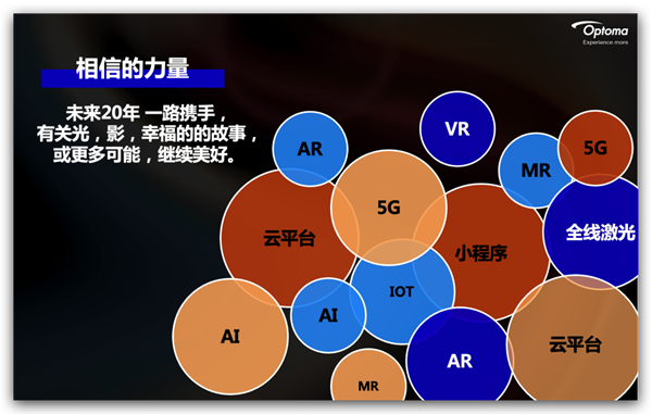 接下來,整個演講貫穿主題思路“穿越 沉浸 融合”,為大家指點(diǎn)江山,規(guī)劃未來!“Optoma provides Big Image solution奧圖碼提供大型顯示方案的增值服務(wù)”,奧圖碼兌現(xiàn)2019許下的承諾,如今,以更加堅(jiān)定的信念和無比自信心規(guī)劃未來藍(lán)圖。