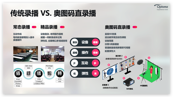 第二部分,就核心技術(shù)與特色,為大家一一剖析與效果呈現(xiàn),傳統(tǒng)錄播 VS. 奧圖碼直錄播;傳統(tǒng)課件 VS. 奧圖碼3D課件,兩部分內(nèi)容用比較的方式深入淺出的理解奧圖碼智慧教育核心科技。