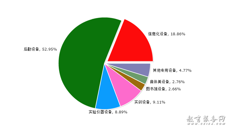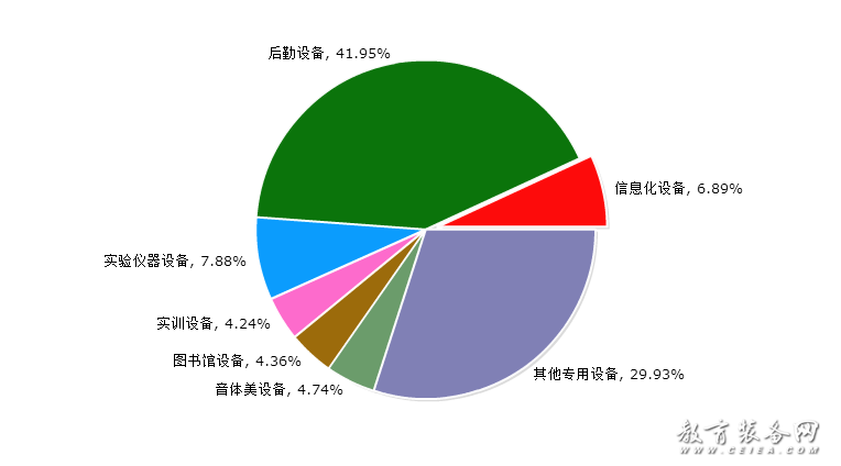 根據對教育裝備細分的歸納,教育裝備網將教育裝備具體劃分為七大類,即信息化設備(含智能平板、錄播系統(tǒng)、智慧黑板等),后勤設備(含校園基建、安防設備、食堂設備、課桌椅等),實驗儀器設備(含儀器儀表、實驗室平臺等),實訓設備(含實訓系統(tǒng)、實訓設施等),圖書館設備(含借還系統(tǒng)、微型圖書館等),音體美設備(含樂器、體育設施、美術用品等),其他專用設備(含創(chuàng)客教育、心理健康特教設備等)。