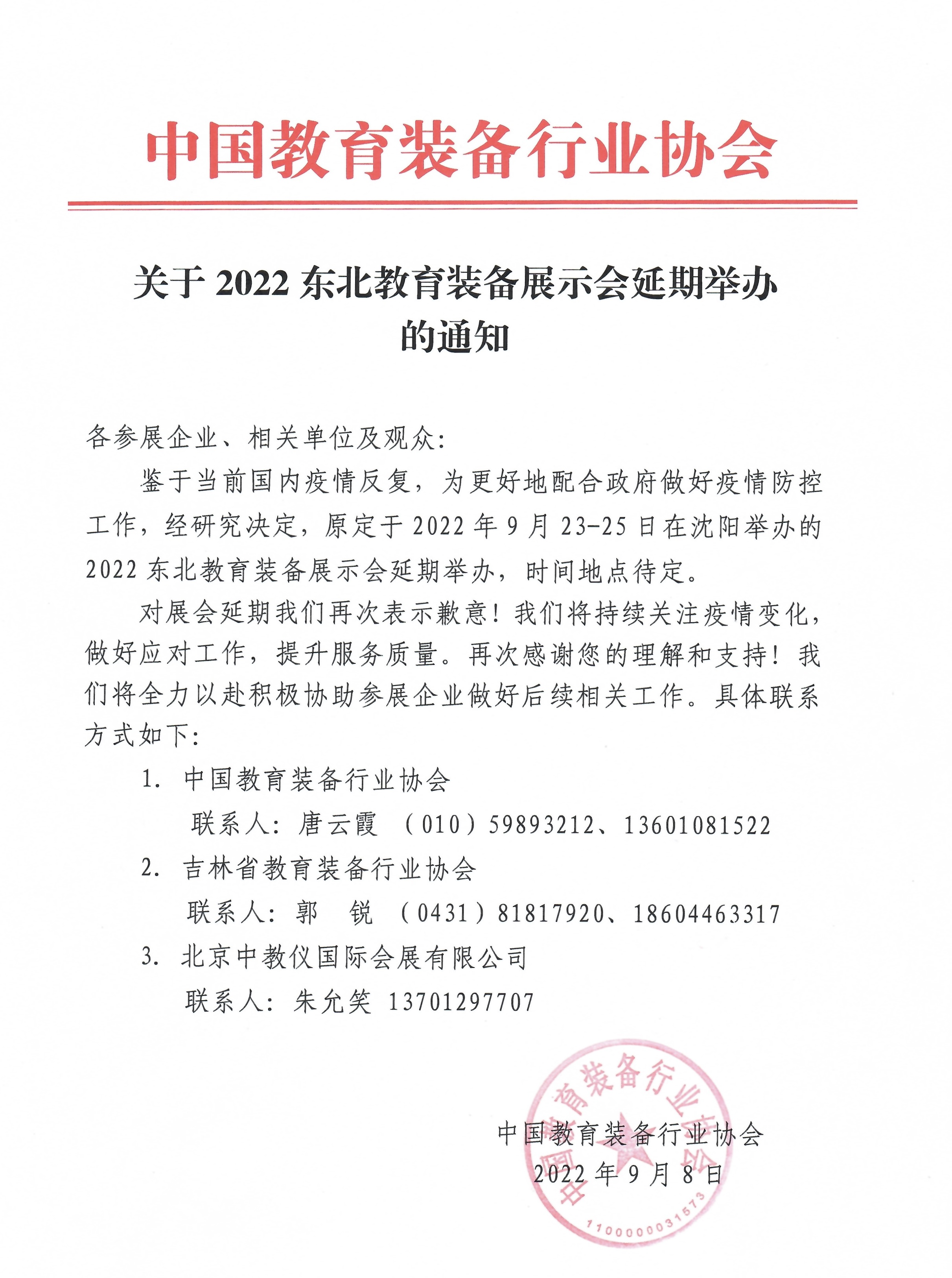 鑒于當前國內疫情反復,為更好地配合政府做好疫情防控工作,經研究決定,原定于2022年9月23-25日在沈陽舉辦的2022東北教育裝備展示會延期舉辦,時間地點待定。