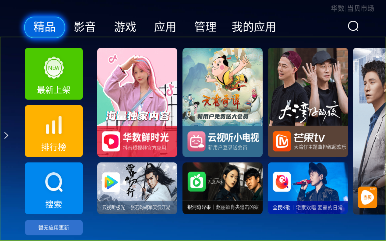 不僅Miracast投影、CollaVision投影、文件管理、文件查看等已有功能都被清晰展現,還可以通過當貝市場自由下載安裝APP,主頁上可以展示和更換各種已下載的APP,也可以將它們直接打開。