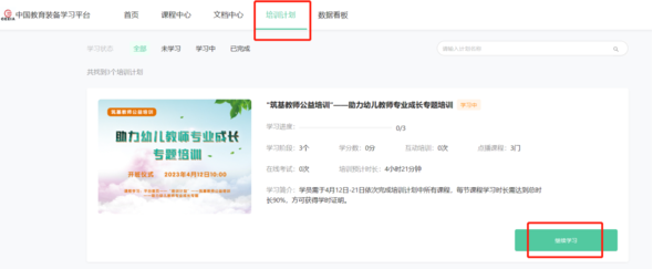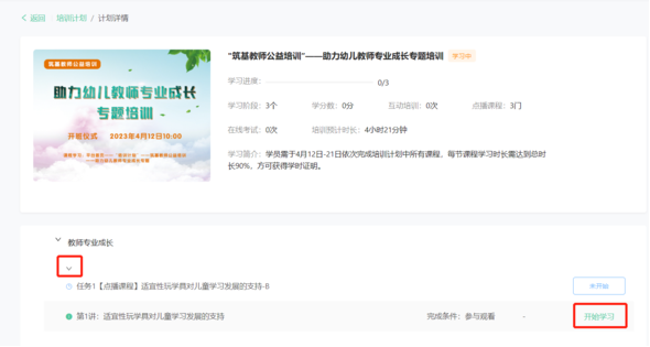 課程學習:4月12日14:00—21日24:00,在平臺首頁——“培訓計劃”,找到《“筑基教師公益培訓”——助力幼兒教師專業成長》計劃,點擊“開始學習”進入計劃,依次學習課程。