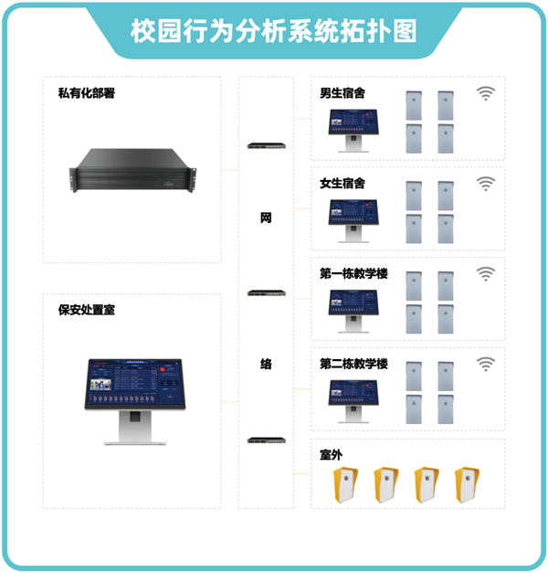 校園防欺凌AI預警終端含高性能芯片,內嵌智能語音算法,支持遠程監控、人體偵測、支持wifi無線連接、性能穩定,部署靈活,能夠實現24小時全天監測,是加速平安校園建設、切實維護師生健康、校園安全和社會穩定的智慧好幫手。