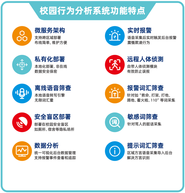 AI校園行為分析反霸凌系統,由校園行為分析管理中心、預警終端、處置終端構成。可部署在宿舍、衛生間、教室、走廊等攝像頭無法覆蓋的安全盲區,當預警終端設備監測到“救命”、“打架”、“打他”等呼救敏感關鍵詞,實時觸發報警功能,通過處置終端通知學校安保人員,實施廣播驅離,及時震懾欺凌,將事后追溯轉變為事前預警及事中干涉。