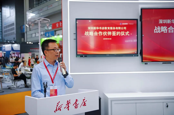 本次展會期間,深圳新華書店教育服務有限公司舉辦了戰略合作簽約儀式,與廣州長鵬光電科技有限公司、深圳市方直科技股份有限公司、廣東劉之頓信息技術有限公司、深圳數聯天下智能科技有限公司、深圳市智樂園科技股份有限公司、深圳市中圖信息技術有限公司等業內知名企業共同攜手,為深圳教育的發展持續貢獻更多優質服務。