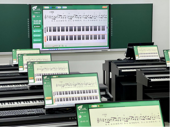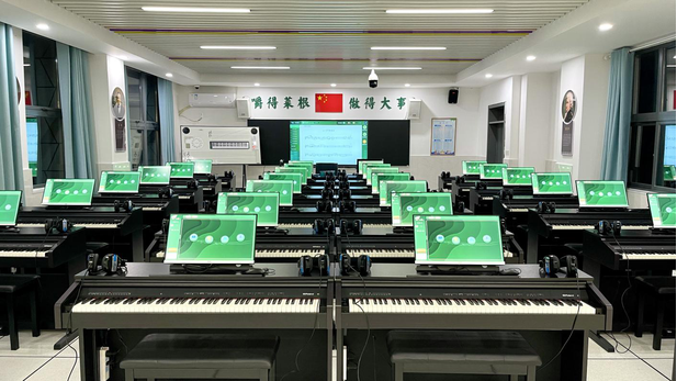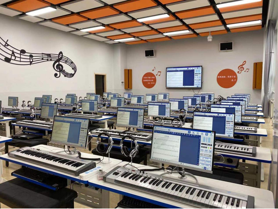 電鋼琴集體課教學不同于常規文化理論學科,其學習過程中需要大量的學生參與時間及練習。在該項目中,改造后的智慧電鋼琴教室不僅為每一個學生配備了數碼鋼琴,還在數碼鋼琴上加裝了專用PC平板一體機。系統以音頻感受、視覺感受為兩個獨立的交互通道。可以讓學生在學習彈琴的過程中,不僅有著良好的聽覺感受,還可通過PC平板一體機感受到更多的視覺信息,比如教材彈唱、琴鍵交互、彈奏測評、指法力度、自由彈唱、節奏訓練、娛樂游戲等多種與電鋼琴教學密不可分的教學環節,是專為鋼琴集體課教學打造的專業智慧電鋼琴教室。