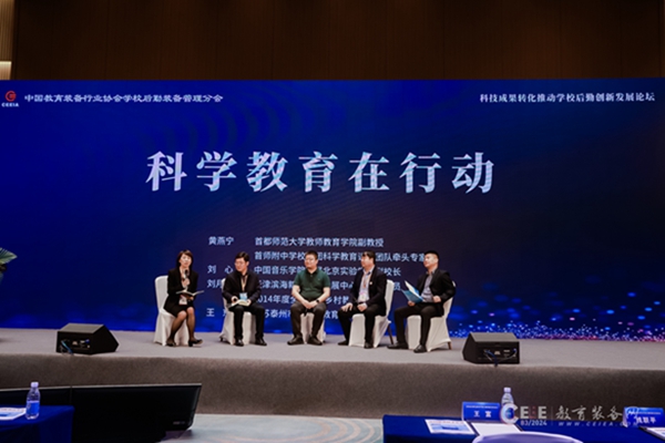 圓桌論壇環節,首都師范大學教師教育學院副教授、首師附中學校集團科學教育課程團隊牽頭專家黃燕寧,中國音樂學院附屬北京實驗學校副校長劉心,天津海濱新區教師發展中心科學教研員、2014年度全國最美鄉村教師劉月升,江蘇泰州市姜堰區教育局副局長王東,中國航空器擁有者及駕駛員協會趙珠寶圍繞“科學教育在行動”主題進行了分享交流。